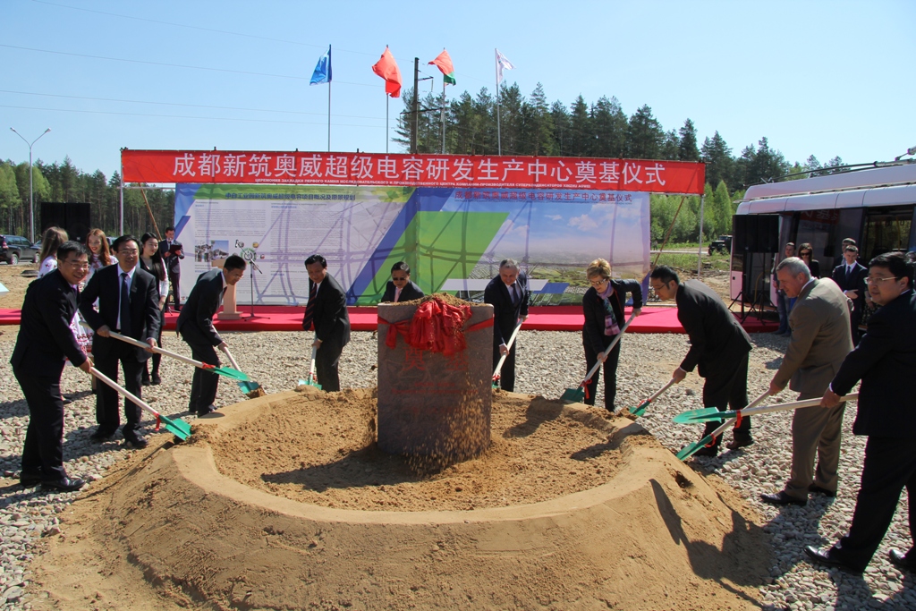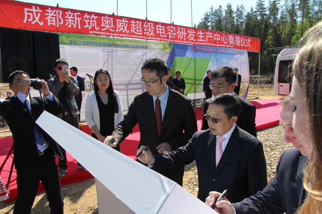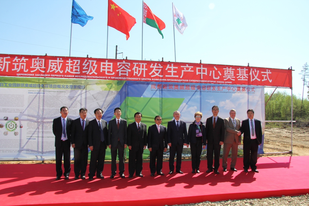 中白合资公司CEO胡政和中国驻白俄罗斯大使馆刘雪松参赞发言时总结新筑奥威超级电容项目是中白工业园“四个第一”项目:即是园区第一个正式动工的生产型企业;第一个已取得白俄罗斯具体订单的项目;第一个入园的具有世界领先水平的高科技项目;第一个当年开工,当年竣工的入园企业在建项目。
