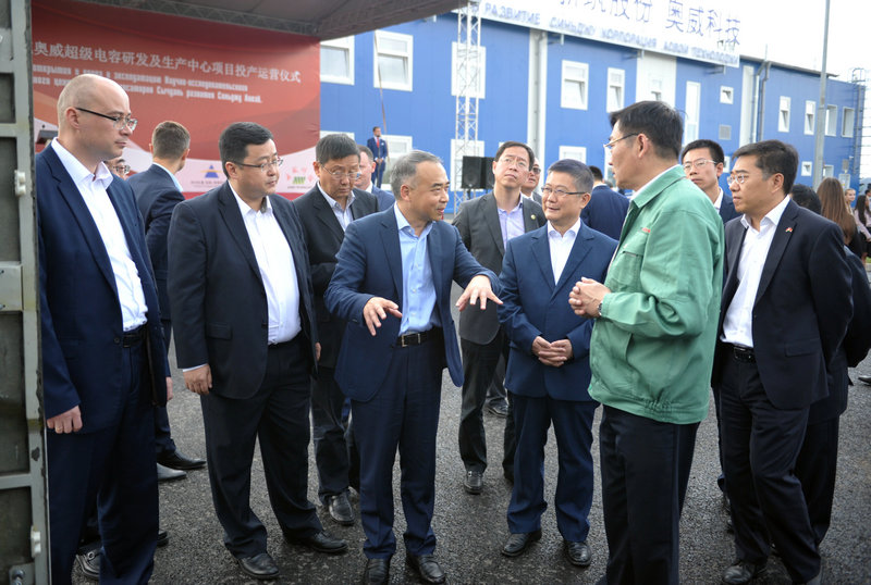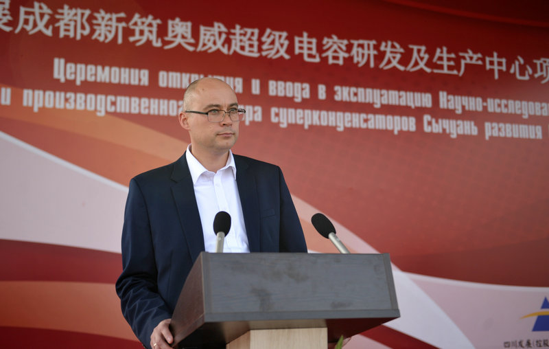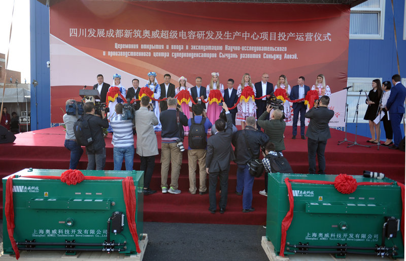 致辞结束后,四川省委常委、成都市委书记范锐平先生、中国驻白俄罗斯大使崔启明先生、白俄罗斯经济部副部长马图谢维奇先生、中白工业园区管委会副主任伊格里先生、中白工业园合资公司总经理李海欣先生和四川发展成都新筑股份党委书记、董事长肖光辉先生共同为首批下线的超级电容产品进行剪彩。在全场嘉宾热烈的掌声中,成都新筑奥威超级电容研发及生产中心正式投产运营及产品下线仪式落下帷幕。