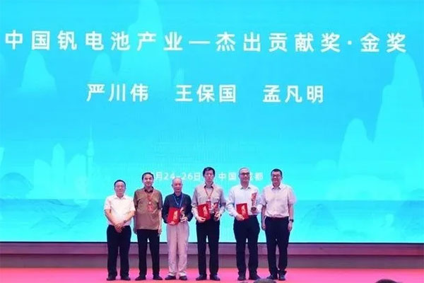 为严川伟、王保国、孟凡明颁发杰出贡献奖·金奖,表彰他们以热情、专业和坚持,积极推动中国钒电池产业发展,在相关领域取得重大突破,做出重要贡献,是钒电池技术进步的重要实现和推动者。